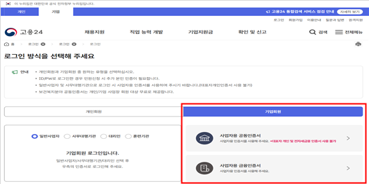 1. 고용24 홈페이지 - 기업회원 로그인