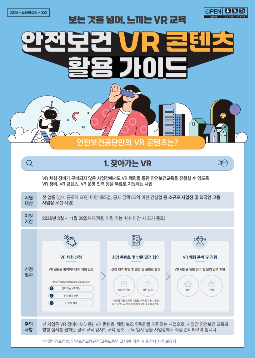 산업안전포털 안전보건자료실에 [안전보건VR 콘텐츠 활용 가이드]가 게시되었습니다.